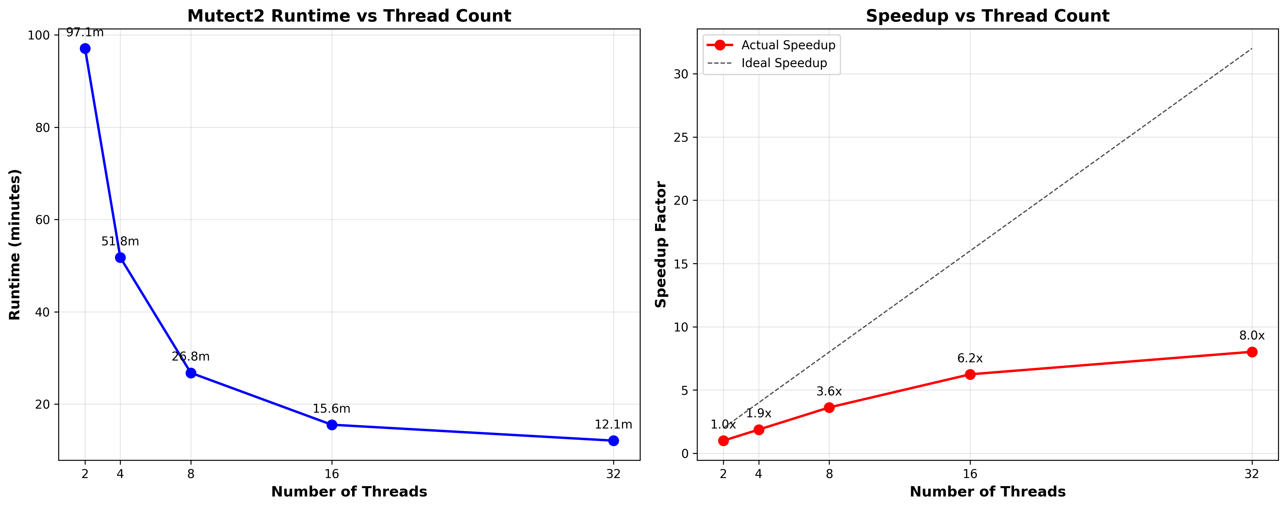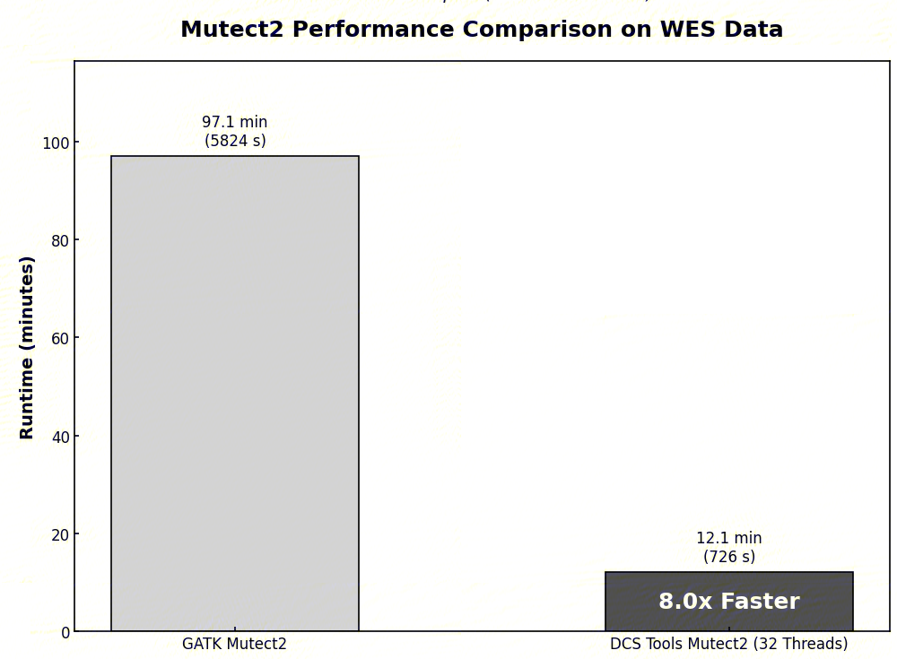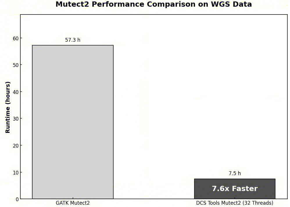 参考1.2-1.3步骤,得到了样本的BAM文件后,体细胞变异检测部分可以使用DCS Tools的Mutect2工具,该工具是GATK Mutect2的加速版本,增加了多线程参数。在 32 线程配置下获得 8 倍左右的速度提升。