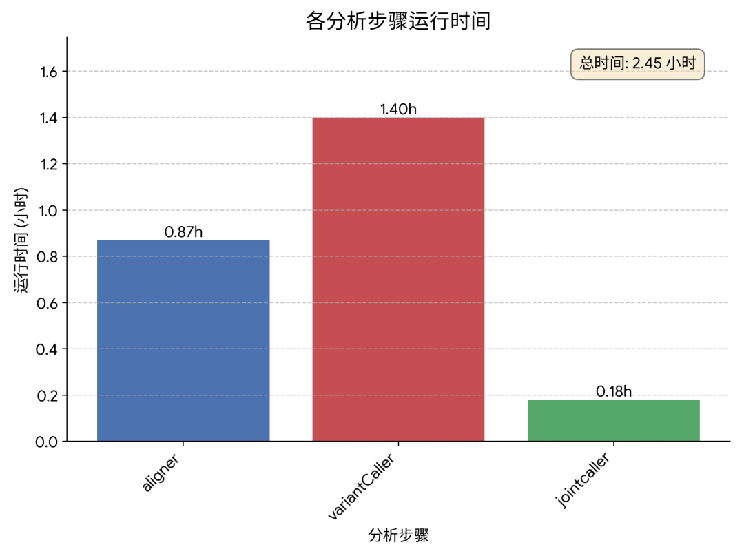 动植物基因组30X数据测试显示,单样本变异检测大部分在2小时内完成分析,与GATK的一致性SNP达到99.98%以上,Indel达99%以上,并且支持多倍体分析(在variantCaller步骤设置ploidy参数)。分析步骤与上面大型队列类似,其中碱基质量值矫正步骤为可选步骤(如果该物种有相应数据库,建议开启该步骤)。